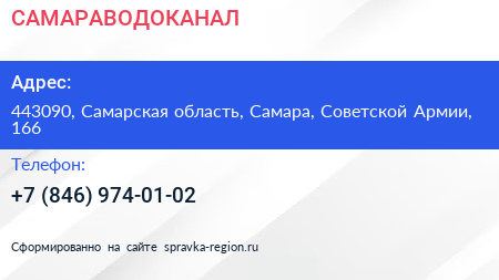 САМАРАВОДОКАНАЛ по адресу 443090, Самарская область, Самара, Советской Армии, 166 в дальнейшем Организация, размещена в следующих категориях: