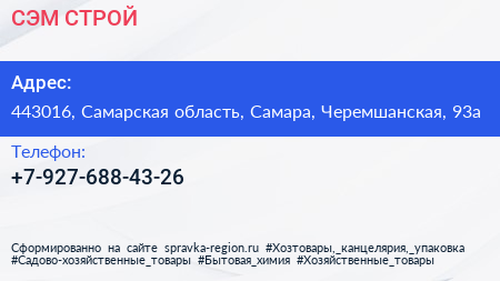 СЭМ-СТРОЙ по адресу 443016, Самарская область, Самара, Черемшанская, 93а в дальнейшем Организация, размещена в следующих категориях: