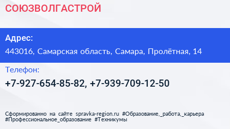 СОЮЗВОЛГАСТРОЙ по адресу 443016, Самарская область, Самара, Пролётная, 14 в дальнейшем Организация, размещена в следующих категориях: