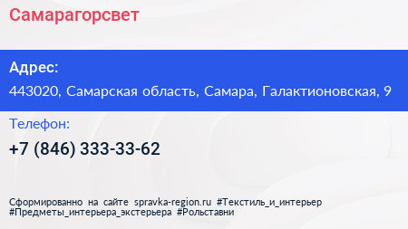 Самарагорсвет по адресу 443020, Самарская область, Самара, Галактионовская, 9 в дальнейшем Организация, размещена в следующих категориях: