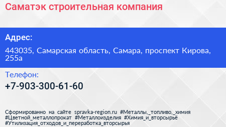 Саматэк, строительная компания по адресу 443035, Самарская область, Самара, проспект Кирова, 255а в дальнейшем Организация, размещена в следующих категориях: