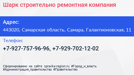 Шарк, строительно-ремонтная компания по адресу 443020, Самарская область, Самара, Галактионовская, 11 в дальнейшем Организация, размещена в следующих категориях: