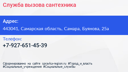 Служба вызова сантехника по адресу 443041, Самарская область, Самара, Буянова, 25а в дальнейшем Организация, размещена в следующих категориях: