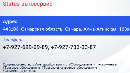 Status, автосервис по адресу 443106, Самарская область, Самара, Алма-Атинская, 183а в дальнейшем Организация, размещена в следующих категориях: