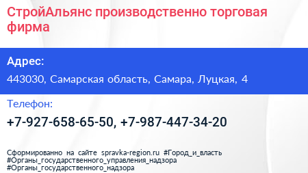 СтройАльянс, производственно-торговая фирма по адресу 443030, Самарская область, Самара, Луцкая, 4 в дальнейшем Организация, размещена в следующих категориях: