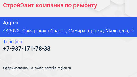 СтройЭлит, компания по ремонту по адресу 443022, Самарская область, Самара, проезд Мальцева, 4 в дальнейшем Организация, размещена в следующих категориях:
