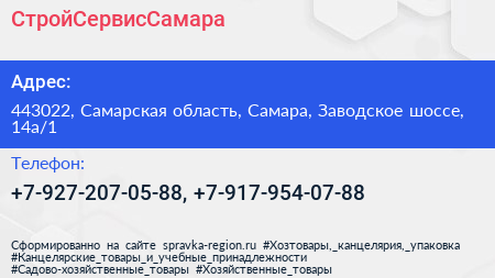 СтройСервисСамара по адресу 443022, Самарская область, Самара, Заводское шоссе, 14а/1 в дальнейшем Организация, размещена в следующих категориях: