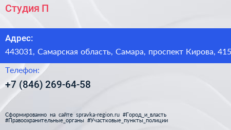 Студия П по адресу 443031, Самарская область, Самара, проспект Кирова, 415 в дальнейшем Организация, размещена в следующих категориях: