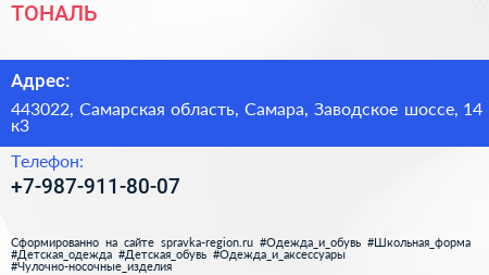 ТОНАЛЬ по адресу 443022, Самарская область, Самара, Заводское шоссе, 14 к3 в дальнейшем Организация, размещена в следующих категориях:
