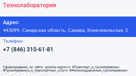 Технолаборатория по адресу 443099, Самарская область, Самара, Комсомольская, 5 в дальнейшем Организация, размещена в следующих категориях: