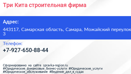 Три Кита, строительная фирма по адресу 443117, Самарская область, Самара, Можайский переулок, 3 в дальнейшем Организация, размещена в следующих категориях: