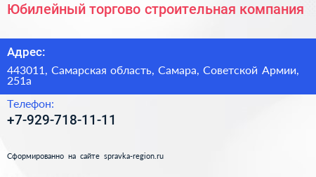 Юбилейный, торгово-строительная компания по адресу 443011, Самарская область, Самара, Советской Армии, 251а в дальнейшем Организация, размещена в следующих категориях: