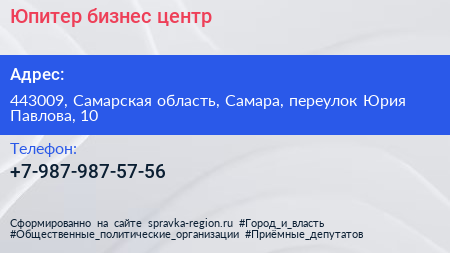 Юпитер, бизнес-центр по адресу 443009, Самарская область, Самара, переулок Юрия Павлова, 10 в дальнейшем Организация, размещена в следующих категориях: