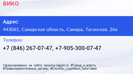 ВИКО по адресу 443061, Самарская область, Самара, Таганская, 26а в дальнейшем Организация, размещена в следующих категориях: