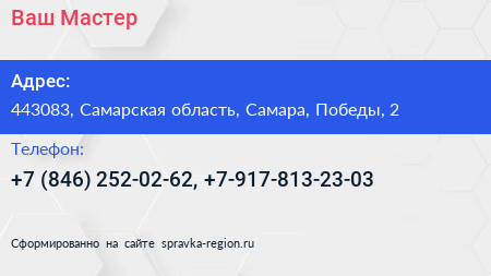 Ваш Мастер по адресу 443083, Самарская область, Самара, Победы, 2 в дальнейшем Организация, размещена в следующих категориях: