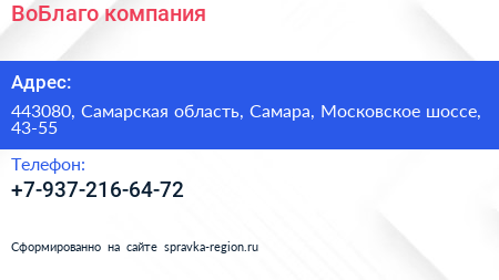 ВоБлаго, компания по адресу 443080, Самарская область, Самара, Московское шоссе, 43-55 в дальнейшем Организация, размещена в следующих категориях: