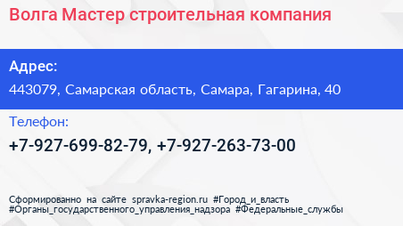 Волга-Мастер, строительная компания по адресу 443079, Самарская область, Самара, Гагарина, 40 в дальнейшем Организация, размещена в следующих категориях: