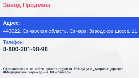 Завод Продмаш по адресу 443022, Самарская область, Самара, Заводское шоссе, 11 в дальнейшем Организация, размещена в следующих категориях: