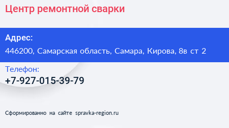 Центр ремонтной сварки по адресу 446200, Самарская область, Самара, Кирова, 8в ст 2 в дальнейшем Организация, размещена в следующих категориях: