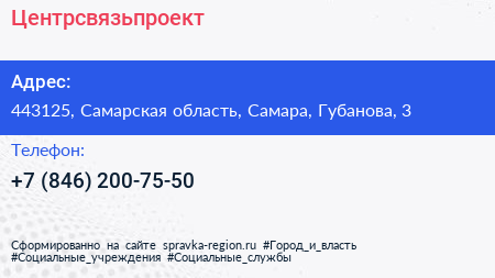 Центрсвязьпроект по адресу 443125, Самарская область, Самара, Губанова, 3 в дальнейшем Организация, размещена в следующих категориях: