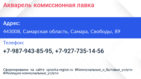 Акварель, комиссионная лавка по адресу 443008, Самарская область, Самара, Свободы, 89 в дальнейшем Организация, размещена в следующих категориях: