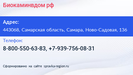 Биокаминвдом.рф по адресу 443068, Самарская область, Самара, Ново-Садовая, 136 в дальнейшем Организация, размещена в следующих категориях: