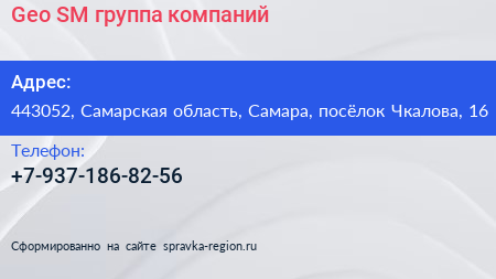 Geo SM, группа компаний по адресу 443052, Самарская область, Самара, посёлок Чкалова, 16 в дальнейшем Организация, размещена в следующих категориях: