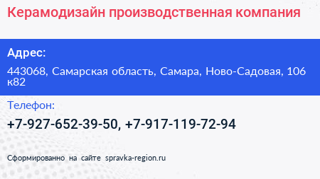 Керамодизайн, производственная компания по адресу 443068, Самарская область, Самара, Ново-Садовая, 106 к82 в дальнейшем Организация, размещена в следующих категориях:
