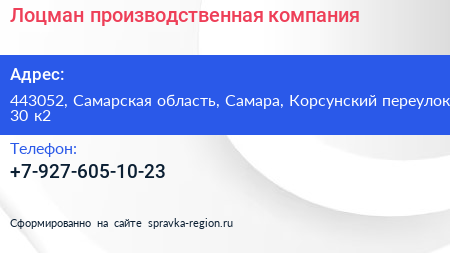 Лоцман, производственная компания по адресу 443052, Самарская область, Самара, Корсунский переулок, 30 к2 в дальнейшем Организация, размещена в следующих категориях: