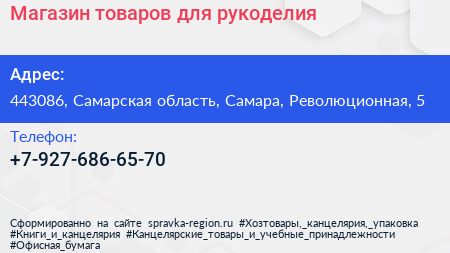Магазин товаров для рукоделия по адресу 443086, Самарская область, Самара, Революционная, 5 в дальнейшем Организация, размещена в следующих категориях: