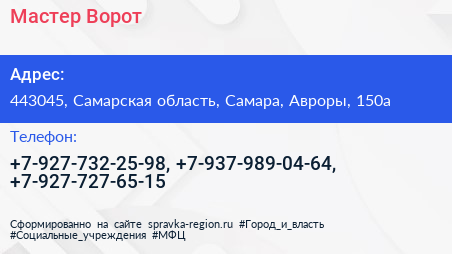 Мастер Ворот по адресу 443045, Самарская область, Самара, Авроры, 150а в дальнейшем Организация, размещена в следующих категориях: