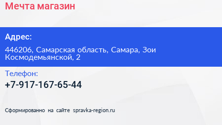 Мечта, магазин по адресу 446206, Самарская область, Самара, Зои Космодемьянской, 2 в дальнейшем Организация, размещена в следующих категориях:
