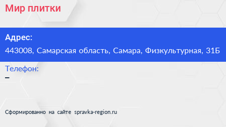Мир плитки по адресу 443008, Самарская область, Самара, Физкультурная, 31Б в дальнейшем Организация, размещена в следующих категориях: