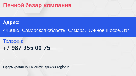Печной базар, компания по адресу 443085, Самарская область, Самара, Южное шоссе, 3а/1 в дальнейшем Организация, размещена в следующих категориях: