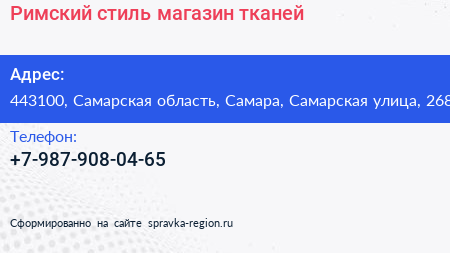 Римский стиль, магазин тканей по адресу 443100, Самарская область, Самара, Самарская улица, 268 в дальнейшем Организация, размещена в следующих категориях: