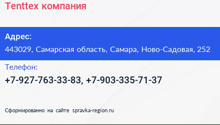 Tenttex, компания по адресу 443029, Самарская область, Самара, Ново-Садовая, 252 в дальнейшем Организация, размещена в следующих категориях: