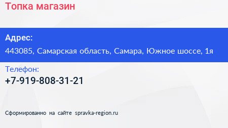 Топка, магазин по адресу 443085, Самарская область, Самара, Южное шоссе, 1я в дальнейшем Организация, размещена в следующих категориях: