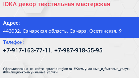 ЮКА декор, текстильная мастерская по адресу 443032, Самарская область, Самара, Осетинская, 9 в дальнейшем Организация, размещена в следующих категориях: