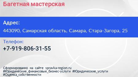 Багетная мастерская по адресу 443090, Самарская область, Самара, Стара-Загора, 25 в дальнейшем Организация, размещена в следующих категориях: