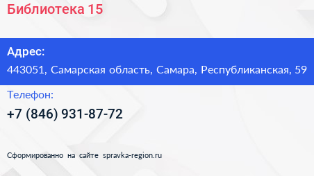 Библиотека №15 по адресу 443051, Самарская область, Самара, Республиканская, 59 в дальнейшем Организация, размещена в следующих категориях: