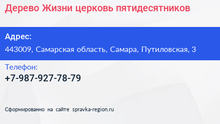Дерево Жизни, церковь пятидесятников по адресу 443009, Самарская область, Самара, Путиловская, 3 в дальнейшем Организация, размещена в следующих категориях: