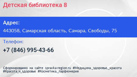 Детская библиотека №8 по адресу 443058, Самарская область, Самара, Свободы, 75 в дальнейшем Организация, размещена в следующих категориях: