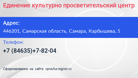 Единение, культурно-просветительский центр по адресу 446201, Самарская область, Самара, Карбышева, 5 в дальнейшем Организация, размещена в следующих категориях: