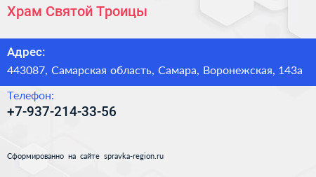 Храм Святой Троицы по адресу 443087, Самарская область, Самара, Воронежская, 143а в дальнейшем Организация, размещена в следующих категориях: