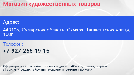 Магазин художественных товаров по адресу 443106, Самарская область, Самара, Ташкентская улица, 100г в дальнейшем Организация, размещена в следующих категориях: