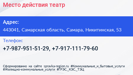 Место действия, театр по адресу 443041, Самарская область, Самара, Никитинская, 53 в дальнейшем Организация, размещена в следующих категориях:
