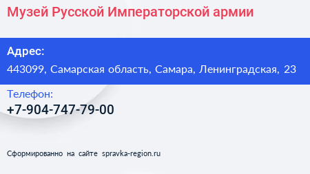 Музей Русской Императорской армии по адресу 443099, Самарская область, Самара, Ленинградская, 23 в дальнейшем Организация, размещена в следующих категориях: