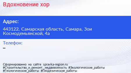 Вдохновение, хор по адресу 443122, Самарская область, Самара, Зои Космодемьянской, 4а в дальнейшем Организация, размещена в следующих категориях:
