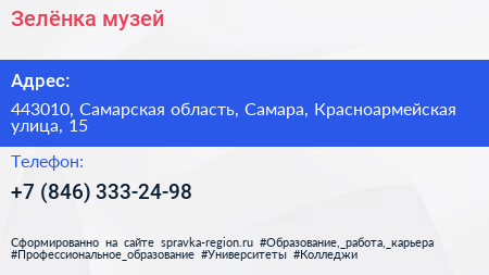 Зелёнка, музей по адресу 443010, Самарская область, Самара, Красноармейская улица, 15 в дальнейшем Организация, размещена в следующих категориях: