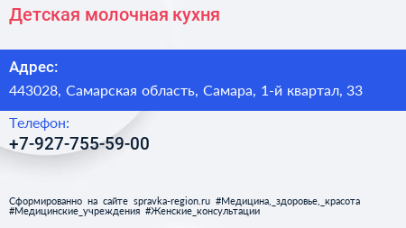 Детская молочная кухня по адресу 443028, Самарская область, Самара, 1-й квартал, 33 в дальнейшем Организация, размещена в следующих категориях: